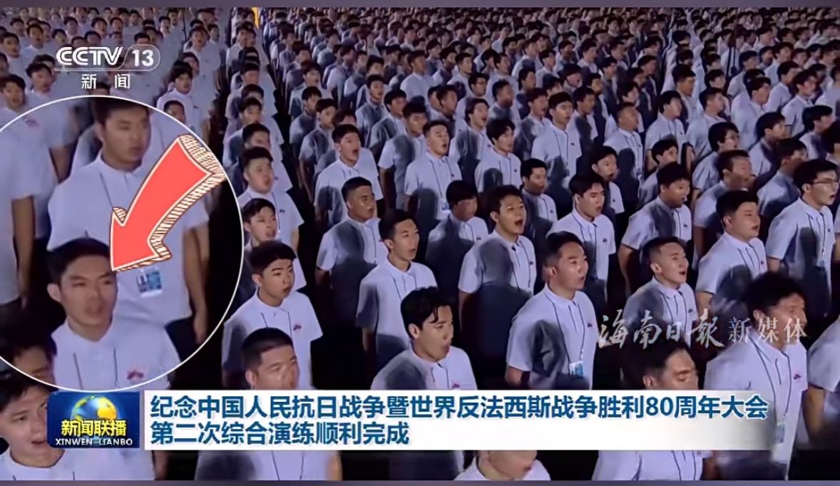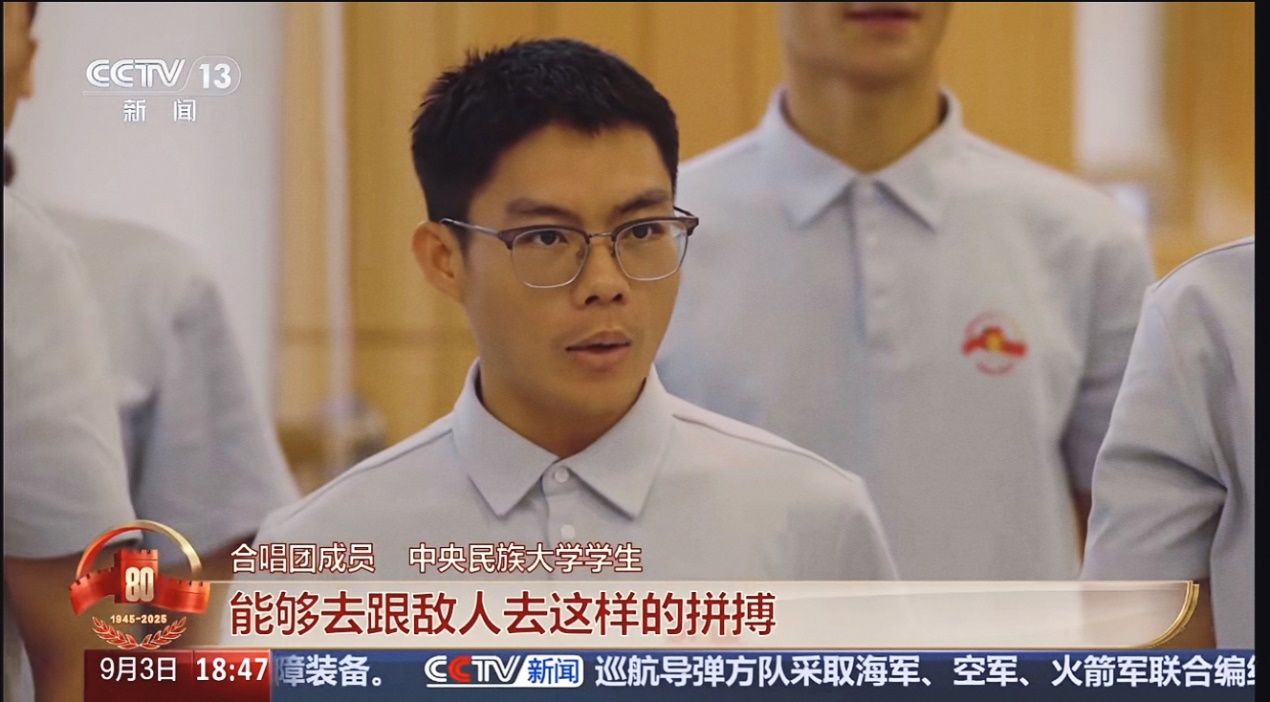 那份激动和自豪交织,在9月3日这天,让黎滩这位来自海南革命老区的同学,紧贴祖国的心房,唱响了对祖国最深情的告白。“我们不仅在唱歌,更多的是在表达我们的家国情怀。当歌曲的旋律响起,我仿佛看见先辈艰苦抗战的峥嵘岁月,也望见我的爷爷年轻时毅然告别家人、奔赴战场的坚定背影。那一刻,我感到家与国、过去与现在,竟如此紧密地相连。”