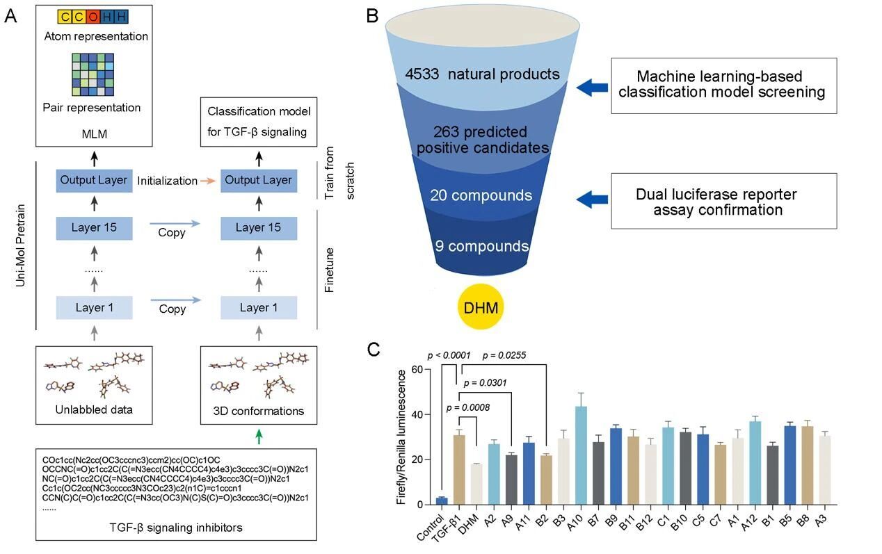 新闻网讯  10月28日,中国工程院主办的中国科技期刊卓越行动计划领军期刊《Engineering》在线发表了太阳城娱乐城药学院王昊教授团队与中国医学科学院医药生物技术研究所游雪甫、杨信怡研究员合作的最新研究成果。太阳城娱乐城2022级博士研究生任一鑫(共同第一作者),基于迁移学习技术,自主构建了高效的TGF-β信号通路抑制剂筛选模型,实现从4533种天然产物到9个高活性化合物的精准筛选。该研究首次揭示了天然黄酮化合物二氢杨梅素通过抑制TGF-β/ALK5信号级联发挥作用的机制,为肺纤维化这一临床难治性疾病的治疗开辟了新型路径。